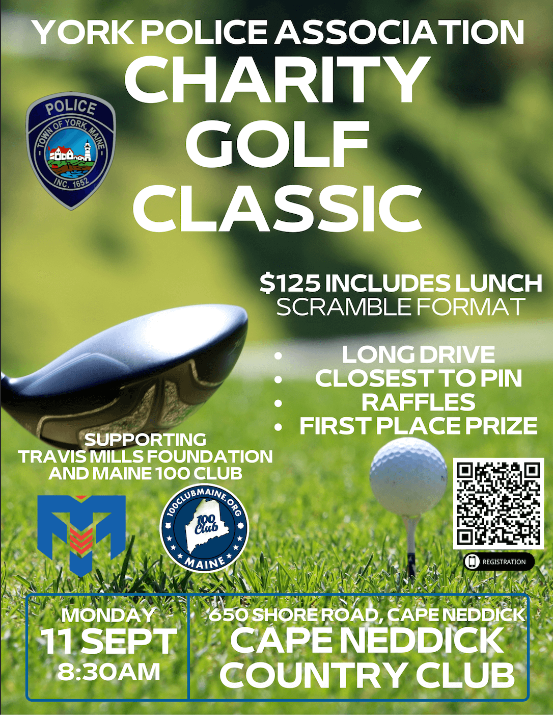 The York Police Association is hosting a Golf Classic on September 11, 2023 to benefit The Travis Mills Foundation and The Hundred Club of Maine. Limited space available, see flyer QR code or click on flyer below to register.
