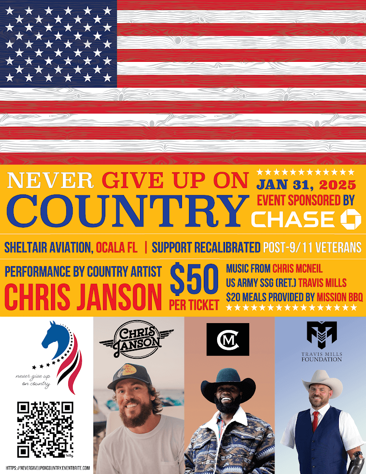 What: Never Give Up On Country Benefit Concert When: Friday, January 31, 2025 Time: 5:00 p.m. - 12:00 a.m. Where: Sheltair Aviation OCF, 1770 Southwest 60th Avenue #Suite 400 Ocala, […]